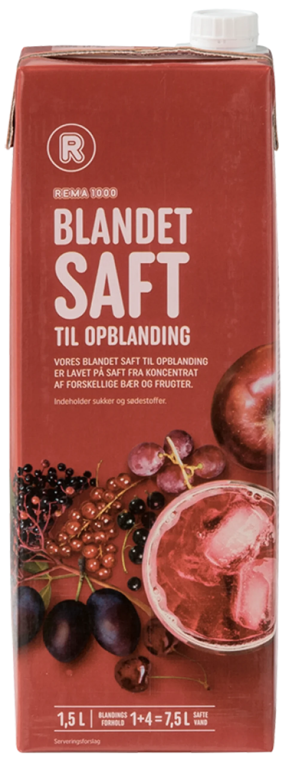 REMA 1000 blandet saft til opblanding er lavet på saft fra koncentrat af forskellige bær og frugter.