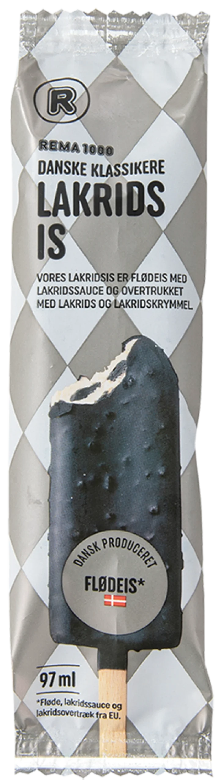 Cremet vaniljeflødeis med en kerne af lækker, flydende salmiaklakrids. Overtrukket med lakrids og små sprøde lakridsstykker.