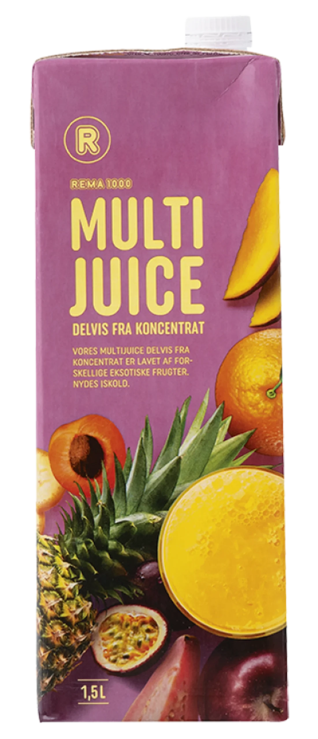 REMA 1000 multijuice delvis fra koncentrat er lavet af forskellige eksotiske frugter. Juicen er perfekt til det danske morgenbord og nydes bedst iskold.