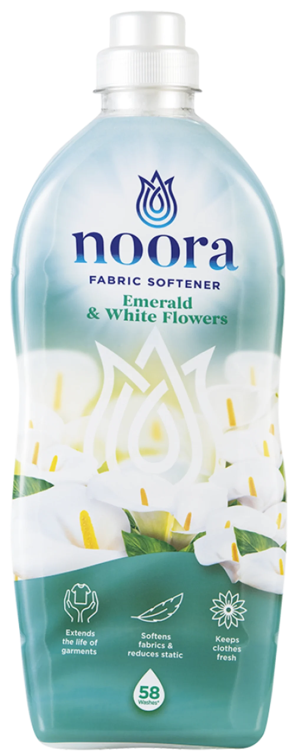 Noora Emerald & white flowers skyllemiddel er et velduftende og effektivt skyllemiddel til maskinvask. Det giver tøjet en uimodståelig blødhed og dejlig frisk duft af blomstrende pæoner. Udover at gøre tøjet blødt og velduftende, beskytter det farver og fibre i vaskeprocessen, så tekstilerne holder længere. En enkelt dosering er nok til pleje af dit tøj. Pas på dit tøj med Noora skyllemiddel.